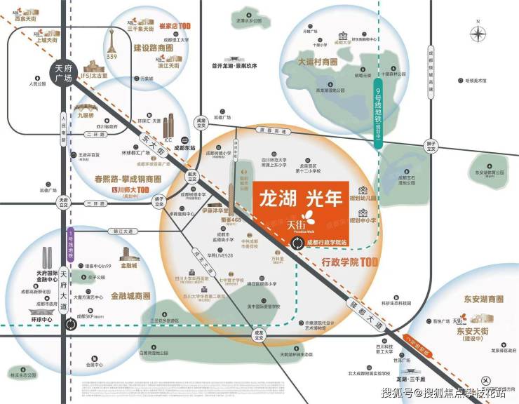 金融城是天府大道的重要节点,东部新城中心是东大街城市主轴的重要节点;金融城的使命是撬动国际城南发展,而东部新城中心的使命是撬动世界城东发展。龙湖光年落子行政学院,5站金融城,10站春熙路,完整承载主城核心资源功能,同时向外辐射870平方公里东部新城,地理优势极为明显。