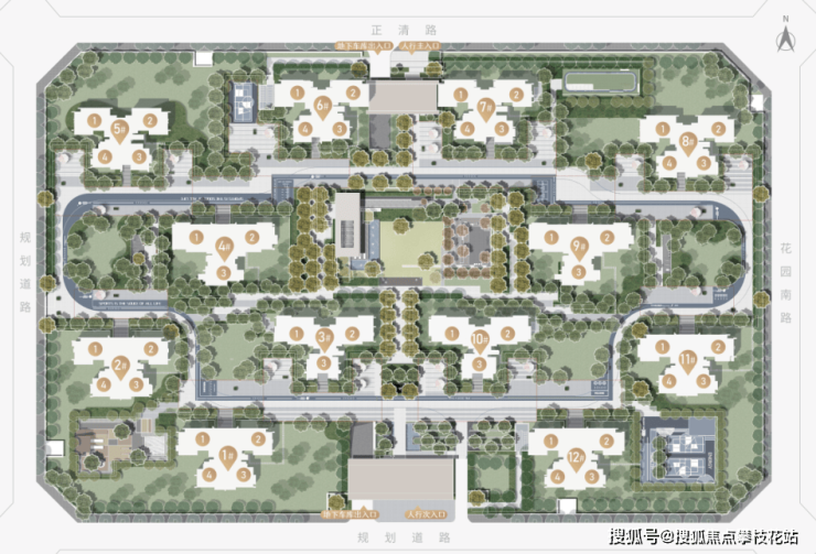 项目占地约58.9亩,容积率仅为2.0,这样的低密纯粹是普通楼盘无法比拟的。从总平图上,我们更能轻易捕捉到项目的亮点所在。项目规划12栋纯住宅,由14-18F小高层组成,采用了高端住区一贯的打造手法:全南北朝向、点阵式中轴对称设计,同时还围合出一个尺度阔绰,面积达3000㎡的超视距中庭。