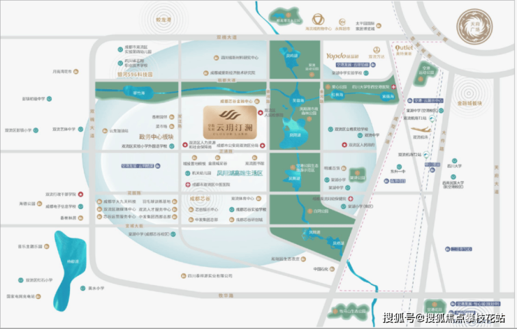 双流体育中心、双流图书馆等文体配套,成都市公安局双流分局、双流区人民检察院、双流区人民法院、双流区人力资源和社会保障局等政府职能部门均落地于此;“城市新地标,未来新中心”的成都芯谷金融中心,仅与项目一街之隔。