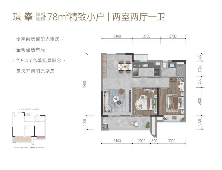 主力户型建面约78㎡二室两厅两卫