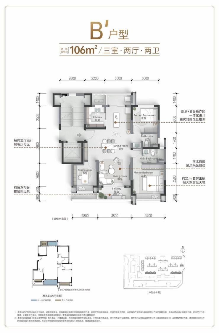 106户型:南北通透竖厅设计,主客分离保私密