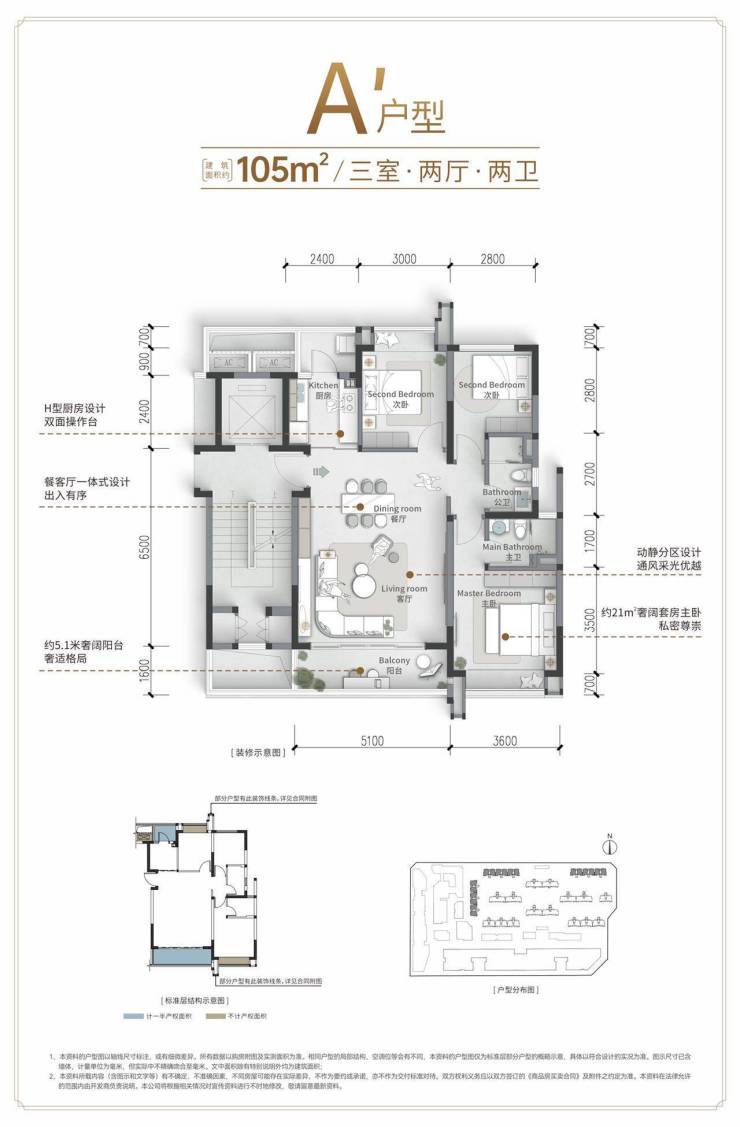 105户型:时尚流行方厅设计,5.1米超大客厅开间