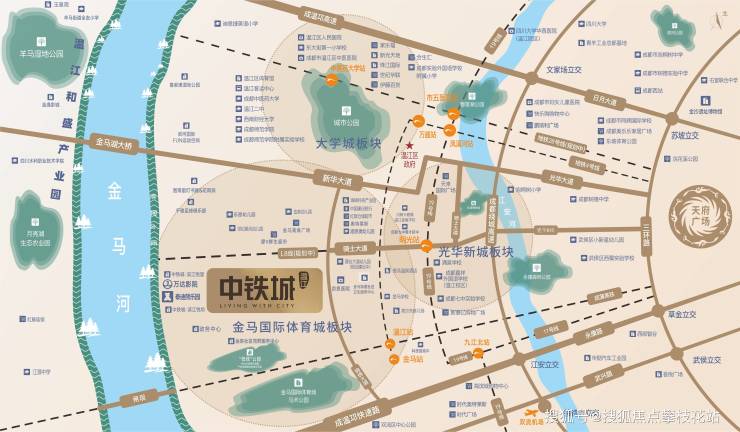 约76.1公里金马河、滨河公园、鲁家滩湿地公园、金马国际体育城马术公园等超1000亩滨河公园,生态资源环绕,主城西生态宜居大境。