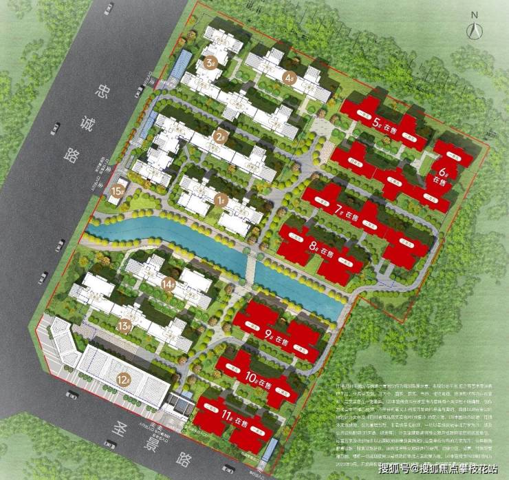 项目西侧临忠诚路、南侧临圣景路。占地约80亩,由一条2800㎡的中轴河景划分为两个地块,容积率仅1.62,绿地率约30%,仅布局13栋6层滨水电梯纯洋房。