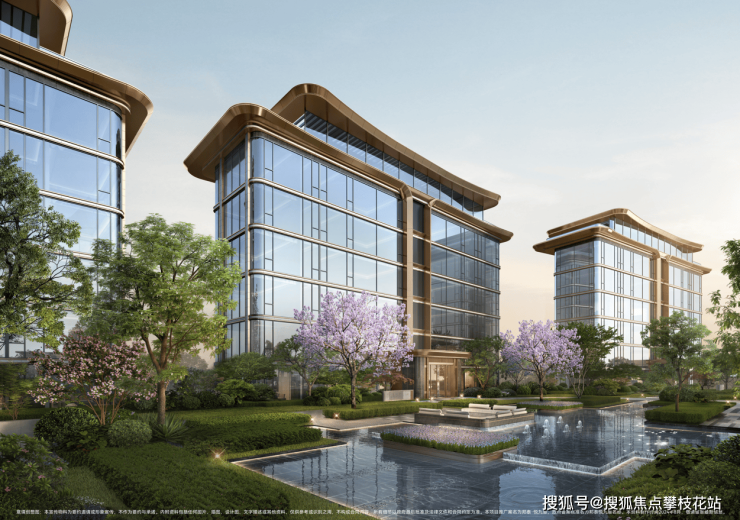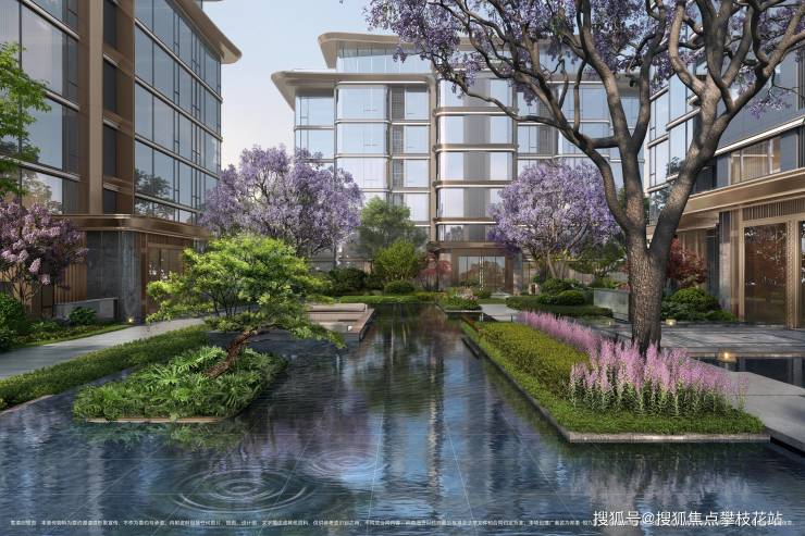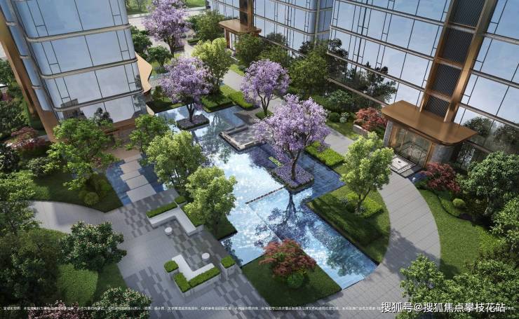 引水入园,打造三大中庭水景,总计约1400㎡水系面积。甄选紫薇、泰山油松、蓝花楹等全球名木,匠造九章景观节点。