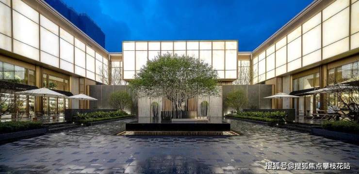 跨进大门门仪是露天庭院,庭院两边是精品商店,一边是入户大门,加上门仪四个空间,组合成像四合院的庭院空间。
