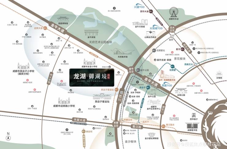 成都龙湖西宸御湖境位于金牛区金卉路与蜀跃路交汇处,属于金牛天府艺术公园板块。这个区域属于成都大城西范围内,是成都资源最富集的区域之一。天府艺术公园片区占地约6270亩,是大型城市公园,包括三个主题花园、三个人工湖泊、三个文化展览馆和三个商业街区。