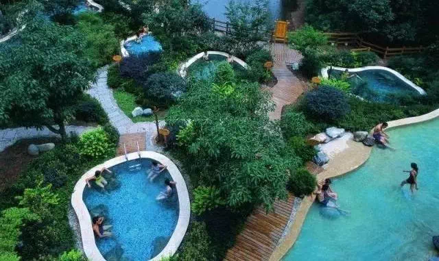 宜宾世外桃源温泉区:神汤温泉是国内罕见的竹林氡泉,占地面积5000平方米,位于蜀南竹海度假区三江汇合处,出水口温度在45-55度之间,因富含丰富的稀有元素氡,被称为保健神泉。