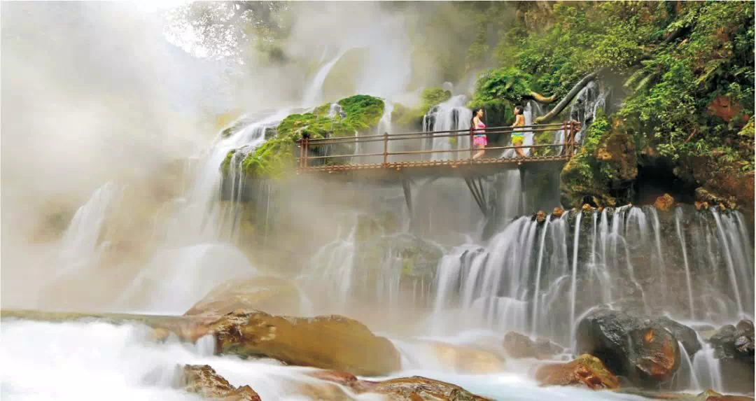 凉山州螺髻九十九里温泉:螺髻山温泉瀑布位于西昌市以南约39公里,常年40度的温泉水从半山悬崖上飞泻而下,其中较高一个瀑布落差50米,由上百个大小不一的温泉瀑布形成一个宽达200余米的温泉瀑布群,十分壮观。目前是全球少有一个可观可赏可饮可泡的温泉瀑布。该温泉属于世界罕见的氡温泉,是温泉中的贵族,在古代只有皇族才能享用。