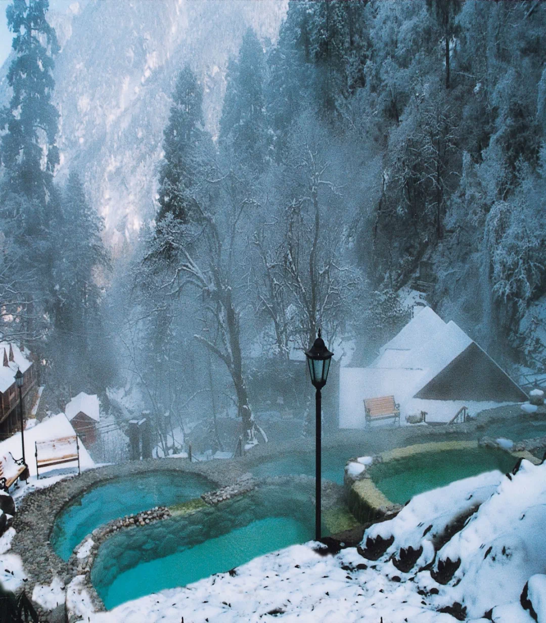 四川的地形多样,温泉常常伴随着高山和冰川一同出现。在冰天雪地的时节,沐浴在从地底涌出的温泉里,身边尽是宛如山间云雾般的水汽环绕,更能深切地感受到大地的能量。