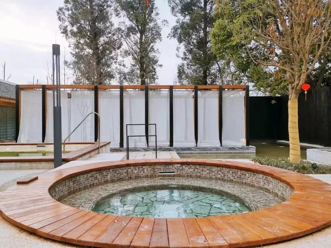 遂宁市龙凤古镇浮生温泉:浮生温泉位于遂宁市龙凤文创园内,温泉区内有13个汤池,其中室内3个,室外10个,包括盐卤温泉、中药池、生姜池、漩涡池、精油池、香薰浴盐池等。有些池子是静态的,也有回旋的、冒泡的。池子景观中的位置都被仔细地考量,以创造一个完全避世的空间,温泉建筑利用老电厂的建筑场地而建,在各个温泉池间漫步时,你能享受到移步换景的乐趣。