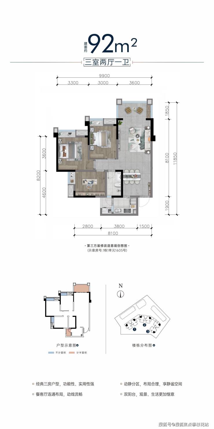 建面约92平套三
