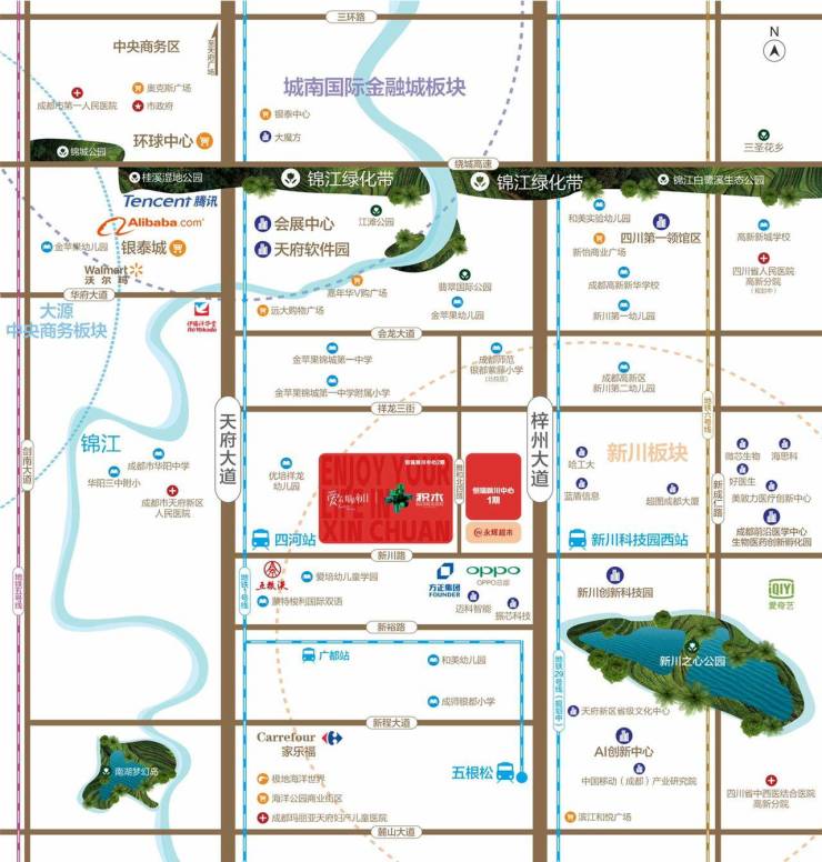 世界向东,中国向西,成都向南,千亿高新,成都向南门户。项目位于高新区内新川板块门户位置,处于高新区和天府新区的核心枢纽位置;