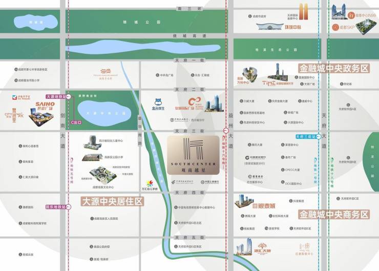 项目所在高新区中央居住中心——大源板块的天府3街,同时占据中央商务区、中央金融区、中央居住区三区之芯,是城南发展的重要中心,地段价值无法复制,地段价值超过物业本身。
