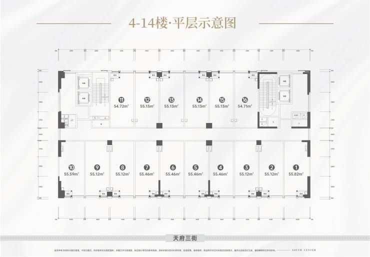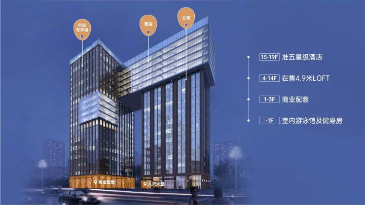 4-14F:在售的4.9米水电气三通的酒店服务式高端公寓,公寓为4梯16户,舒居55㎡,为目前高新区唯一的稀缺物业,绝版物业;15-19F:已入驻准五星级酒店