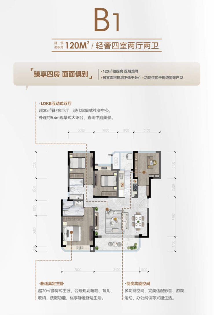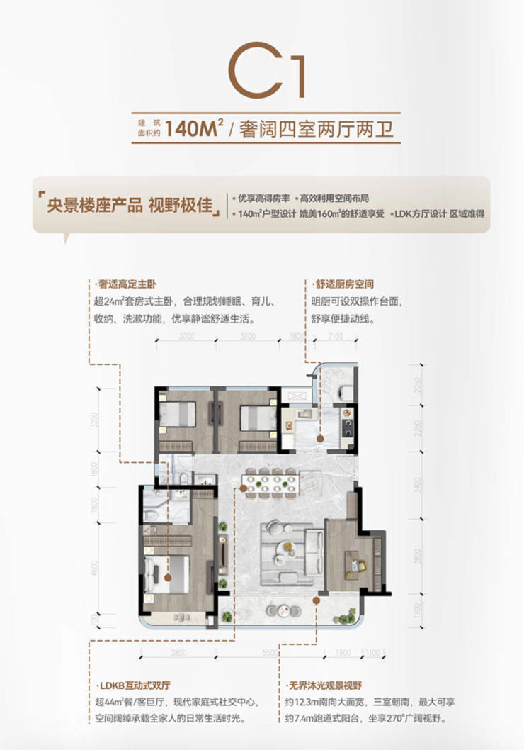约94.5-95.2%高得房率,宽至约7.4m跑道式观景阳台甄选一线精装品牌,定制高端品质生活